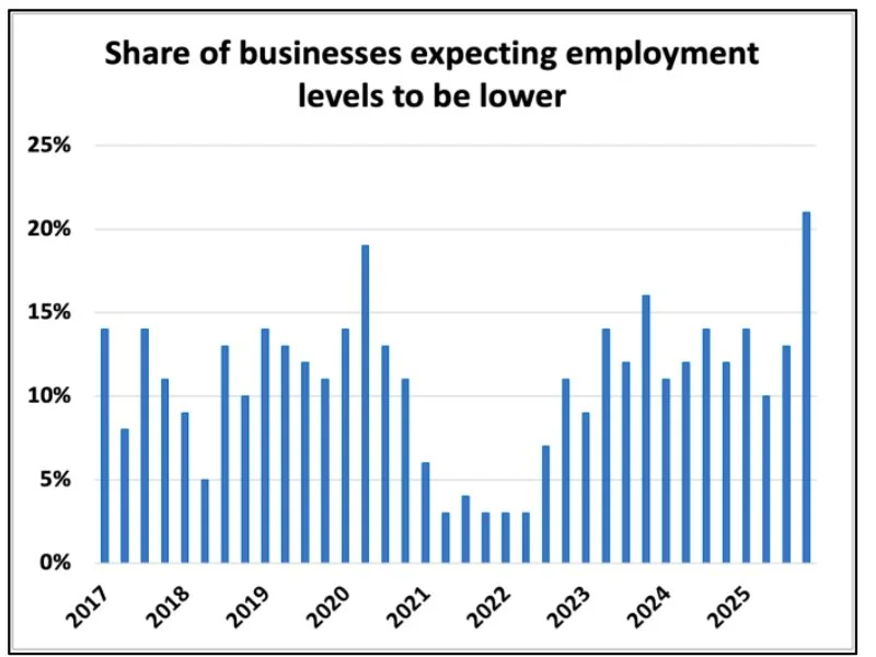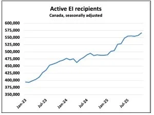 The job market has more slack than the Labour Force Survey suggests. Employment insurance claims jumped 5.9% month-over-month and are up 16% year-over-year. Total payroll employment now sits below year-ago levels—the first non-recessionary annual decline since the dataset began in 2001. The recent Business Outlook Survey shows businesses expect to cut payroll at the highest rate in 10 years.