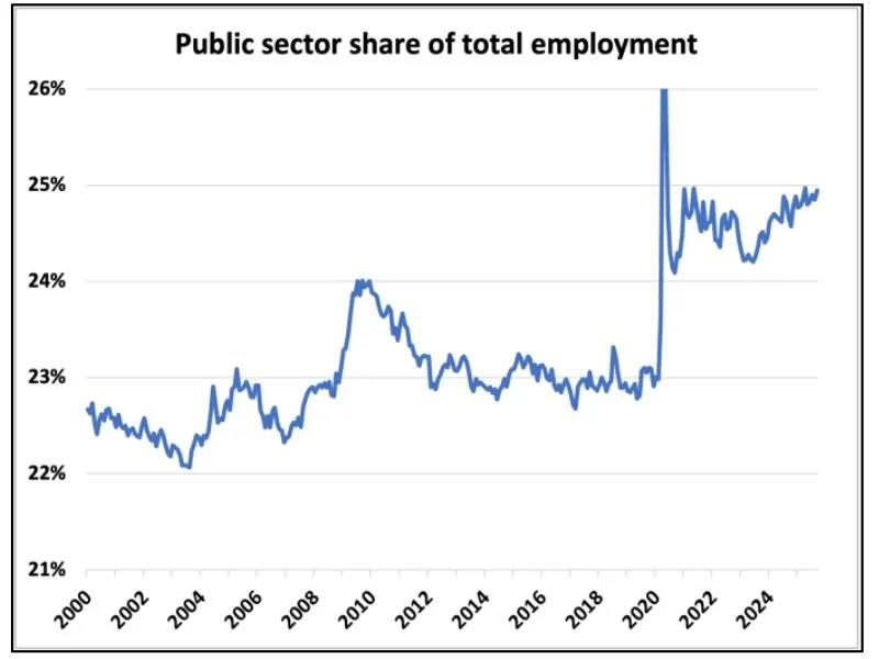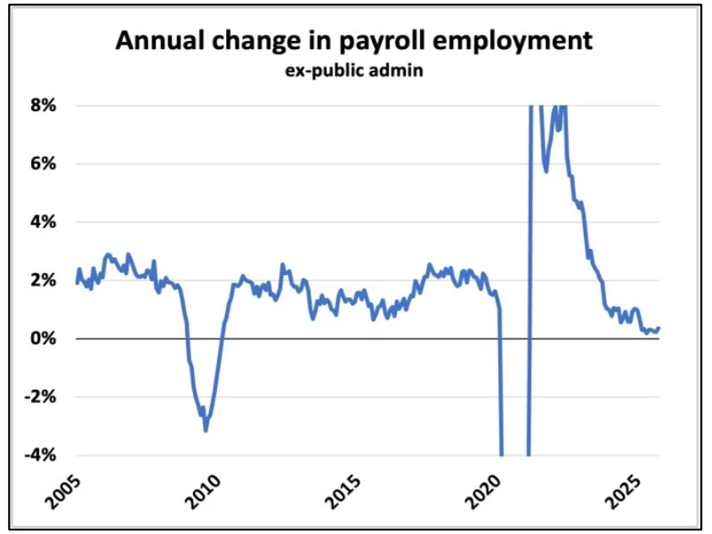 Reports indicate nearly 10,000 federal workers received potential layoff notices last week. This matters because payroll employment excluding public sector administration is at its lowest non-recessionary level on record, while public sector employment has reached 25-year highs.