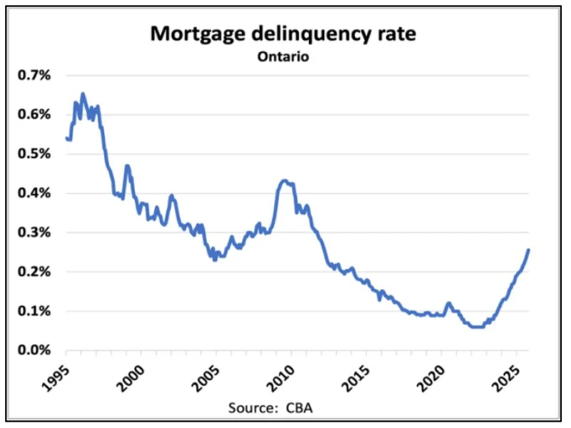The Mortgage Renewal Wall is reaching its peak this year. Approximately 60% of all outstanding Canadian mortgages will renew in 2025 and 2026—one of the largest renewal waves in history. In 2026 alone, roughly 1 million mortgages are scheduled for renewal. Most borrowers will face payment increases of 10% to 20% or more, pulling spending away from disposable income—assuming households can absorb the increase at all. Mortgage delinquencies have risen 7% nationally over the past three months, according to the Canadian Bankers Association.