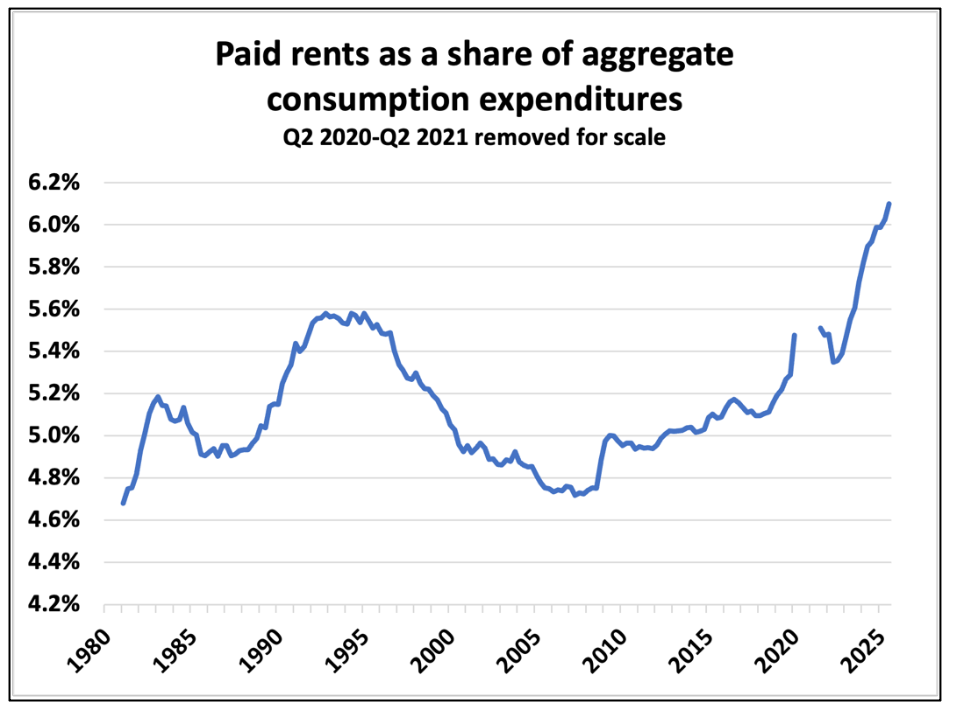 There is a silver lining: rents paid as a share of consumption have hit all-time highs. This is bad for our economy.